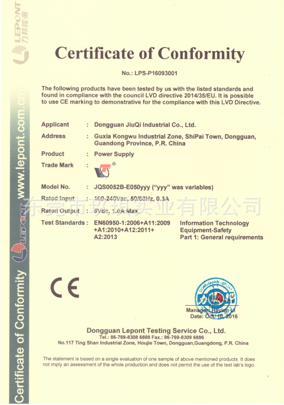 東莞玖琪實業有限公司電源適配器生產廠家:20年經驗,專業開發設計電源適配器,充電器,開關電源,支持開關電源定制生產,通過CE,GS,BS,UL,ETL,FCC,PSE,KC,CCC安規認證!