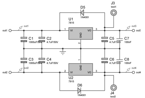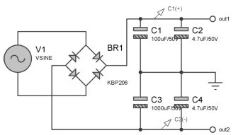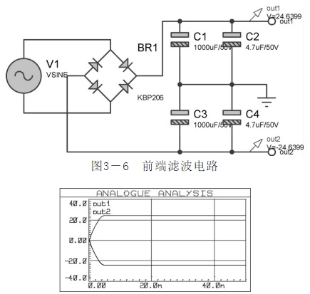 電容濾波一般負(fù)載電流較小,可以滿足放電時(shí)間常數(shù)較大的條件,所以輸出電壓波形的放電段比較平緩,紋波較小,輸出脈動(dòng)系數(shù)S小,輸出平均電壓UO大,具有較好的濾波特性。把電容器和負(fù)載并聯(lián),正半周時(shí)電容被充電,負(fù)半周時(shí)電容放電,就可使負(fù)載上得到平滑的直流電。電路在三端穩(wěn)壓器的輸入端接入電解電容C1=C3=1000μF,用于電源適配器濾波,其后并入電解電容C2=C4=4.7μF用于進(jìn)一步濾波。在三端穩(wěn)壓器輸出端接入電解電容C5=C6=4.7μF用于減小電壓紋波,而并入陶瓷電容C7=C8=100nF用于改善負(fù)載的瞬態(tài)響應(yīng)并抑制高頻干擾(陶瓷小電容電感效應(yīng)很小,可以忽略,而電解電容因?yàn)殡姼行?yīng)在高頻段比較明顯,所以不能抑制高頻干擾)。濾波電路如圖所示。![]() 圖濾波電路 為了驗(yàn)證濾波電路的效果,以前端濾波電路(見(jiàn)圖)為例進(jìn)行分析。 前端濾波電路輸出用示波器監(jiān)視,仿真結(jié)果如圖所示。 ![]() 若我們?cè)噲D將C1電容值調(diào)整為100μF,如圖所示,則會(huì)導(dǎo)致電路輸出端out1與out2輸出電壓大小不等。濾波電路輸出端out1與out2處加入探針,用圖表顯示其輸出結(jié)果,如圖所示。 ![]() 圖調(diào)節(jié)C1后的濾波電路 圖調(diào)節(jié)C1后濾波電路輸出仿真圖 如圖所示,本電路中濾波電路中電容大小除影響電路的濾波效果外,還影響到電橋的整流輸出。若上下電路濾波效果不同,則不會(huì)輸出大小相等的直流電壓有效值,即不會(huì)輸出大小相等的直流正負(fù)電壓。 可見(jiàn)濾波電路在電路出現(xiàn)干擾時(shí)能夠保證電路的穩(wěn)定工作,從而輸出穩(wěn)定的電壓,這在電路設(shè)計(jì)中是十分重要的。