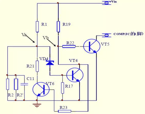 輸入電壓在正常工作范圍內時, Va大于VD4的穩壓值,VT4導通,Vb為0電位,VT5截止, 此時保護電路不起作用;當輸入電壓低于設定欠壓值時,Va小于VD4的穩壓值,VT4截止,Vb為高電位,VT5導通,將COMP(芯片的1腳)拉到0電位,芯片關閉輸出,從而實現了欠壓保護功能。     R21、VT6、R23組成欠壓關斷、恢復時的回差電路。當欠壓關斷時,VT6導通,將R21與R2并聯,;恢復時,VT6截止,,回差電壓即為(Vin’-Vin)。