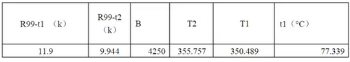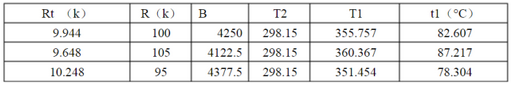 T2:常溫25°C,上式中T2=273.15+25=298.15;B:4250±3%;R:25°C時的電阻值,100k,計算出的T1值也是加了273.15后的值,因此下表中t1=T1-273.15,是攝氏度。 Rt:溫度變化后的阻值,10k,9.704k,10.304k,見上表