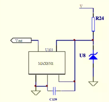 穩壓管給U103MAX6501提供5V電壓,溫度正常時,U103的五腳輸出高電平,當溫度超過保護點時U103的五腳輸出低電平,當溫度恢復后,U103的五腳輸出高電平。